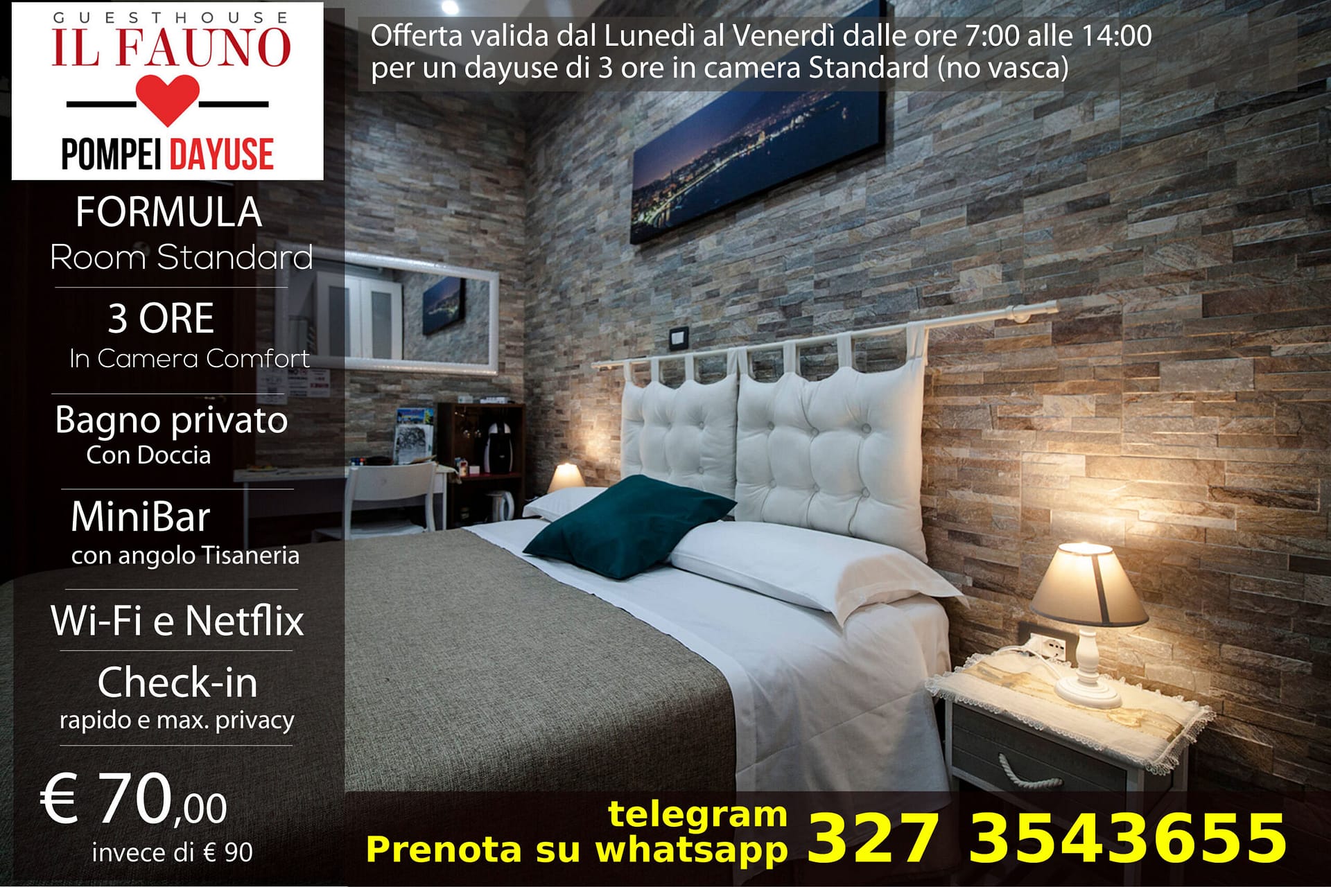 Prenota dal lunedi al venerdi dalle ore 7:00 alle 14:00 un dayuse di 3 ore in camera comfort standard al costo di 70 euro!